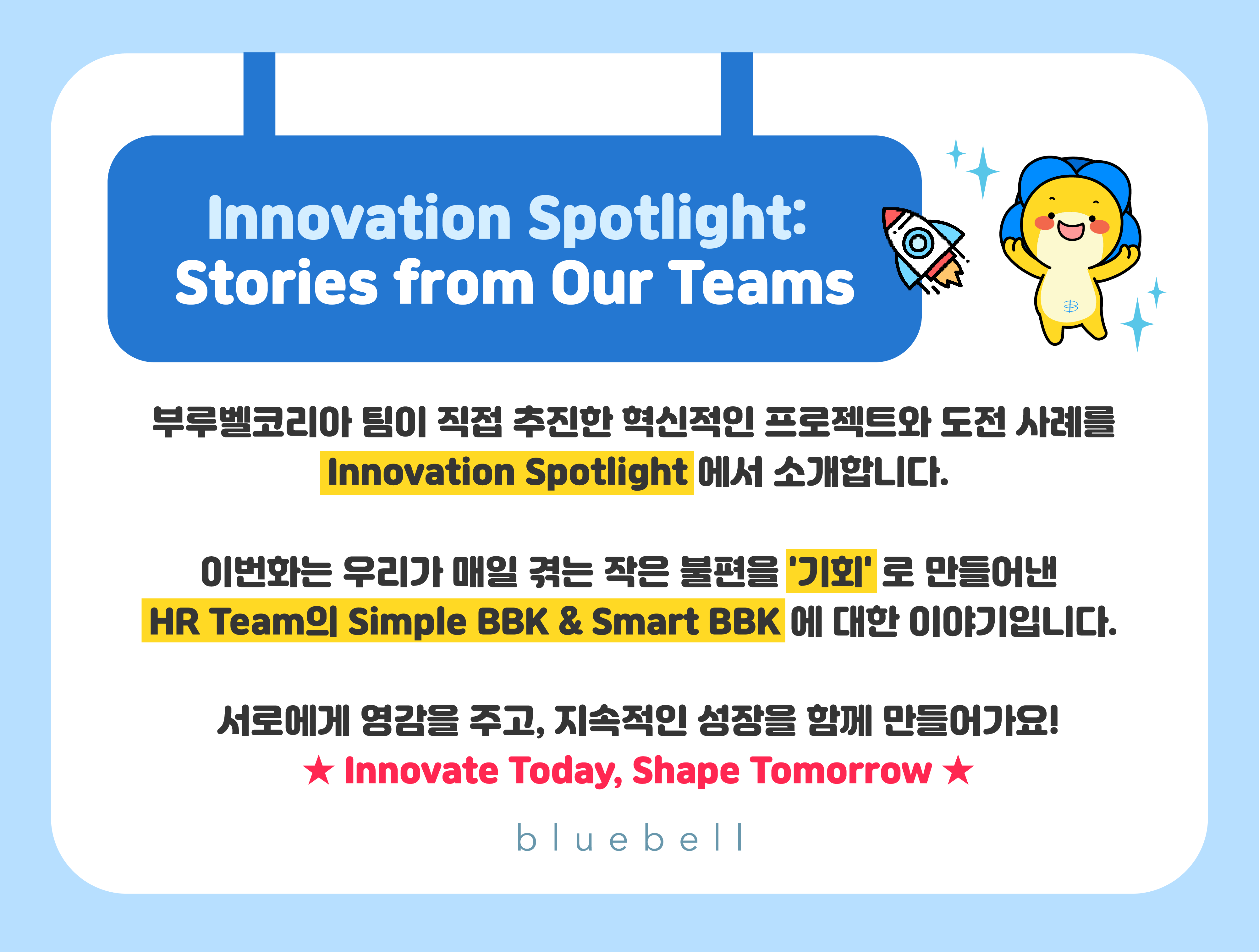 ์ฌํด HRํ์ ์ด๋ฌํ ์ฒ ํ์ ๋ฐํ์ผ๋ก Simple BBK์ Smart BBK, ๋ ๊ฐ์ง ํ์ ์ ์ถ์งํ์ต๋๋ค. ์ธ๋ป ๋ณด๋ฉด ์๋ก ๋ค๋ฅธ ๋ถ์ผ์ ํ๋ก์ ํธ์ง๋ง, ์ฌ์ค์ โ์ฐ๋ฆฌ๊ฐ ๋งค์ผ ๊ฒช๋ ์์ ๋ถํธ์ ์ด๋ป๊ฒ ๋ Simple ํ๊ณ Smart ํ๊ฒ ๋ง๋ค ๊ฒ์ธ๊ฐ?โ๋ผ๋ ๋์ผํ ์ง๋ฌธ์์ ์์๋ ๋ณํ์ ๋๋ค.